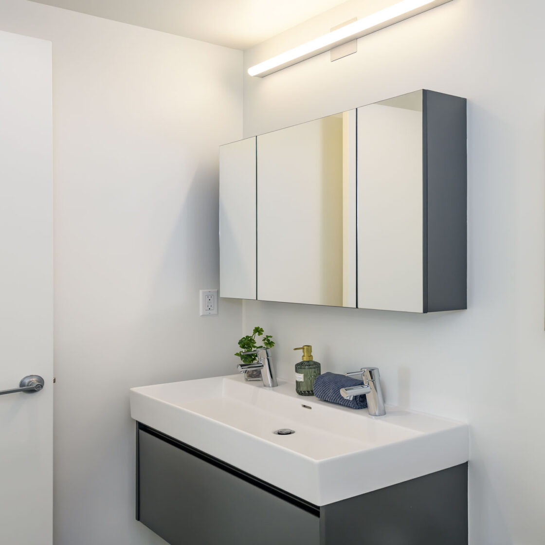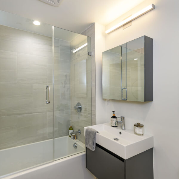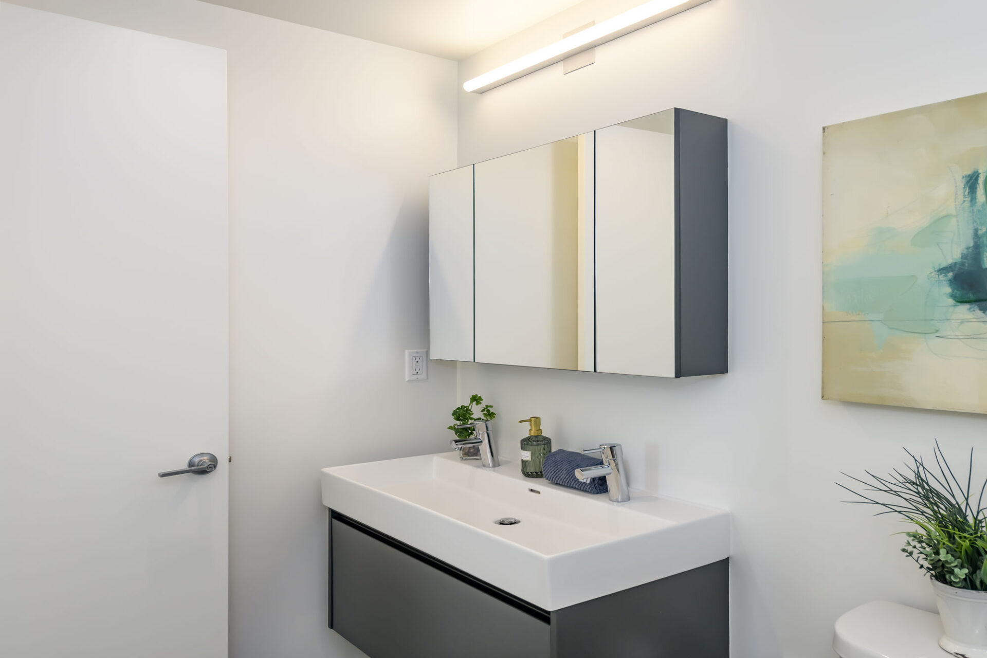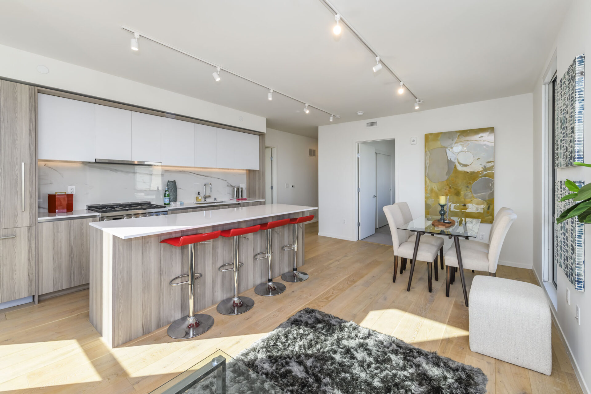 Residents also enjoy access to an expansive common rooftop deck with panoramic skyline views — an exceptional outdoor entertaining space. String lighting overhead creates a warm ambiance for evening gatherings, while multiple seating areas, including communal dining and lounge spaces, offer flexibility for hosting or relaxing. With sweeping urban vistas as the backdrop, the roof deck delivers a true indoor-outdoor lifestyle experience high above the city.