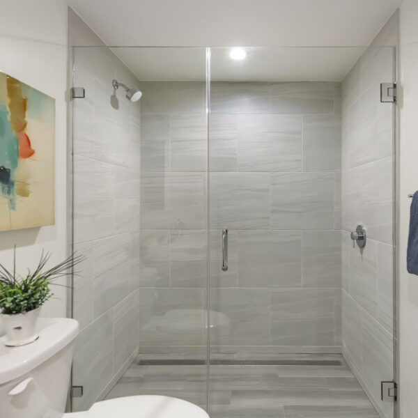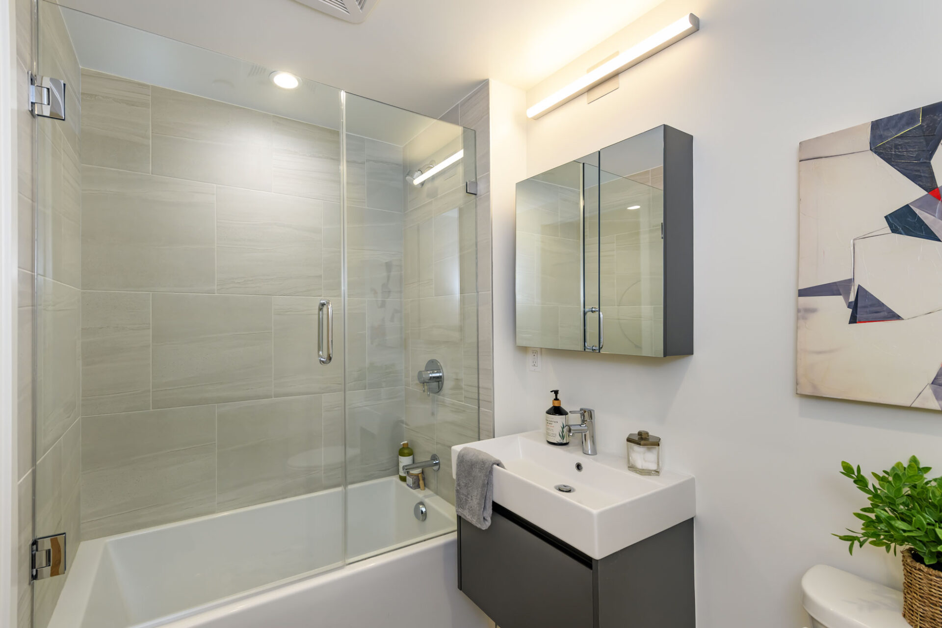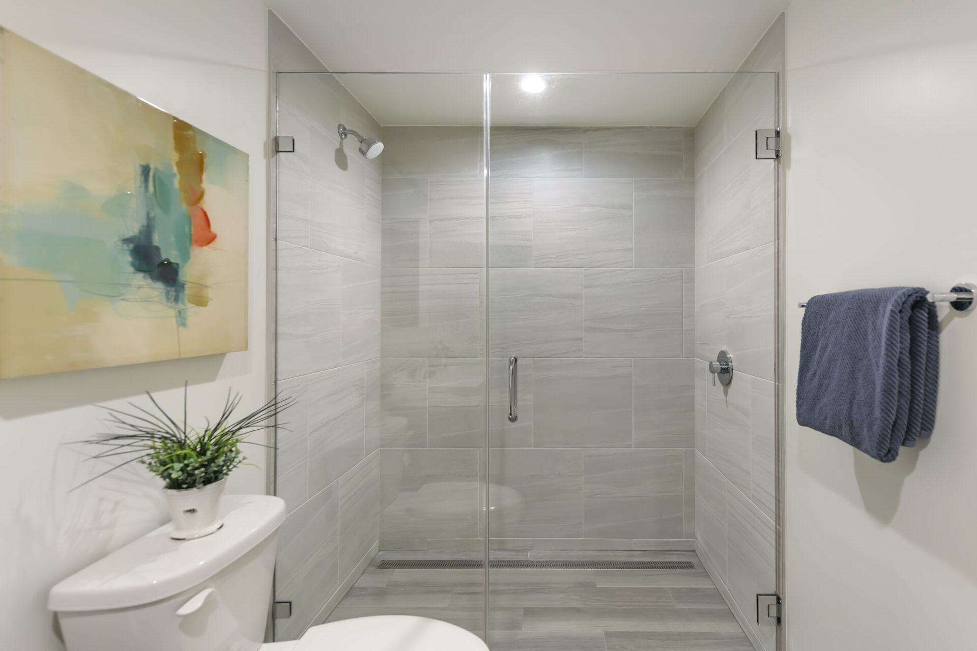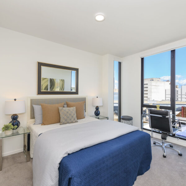 The primary bedroom suite serves as a peaceful retreat, highlighted by a large window that draws in natural light and creates a calm, airy atmosphere. The suite includes a walk-in closet, an additional closet, and a well-appointed en-suite bath with a spacious shower — an inviting space to unwind at the end of the day. The guest bedroom also features floor-to-ceiling windows and city views, while the guest bath offers a shower-over-tub combination. An in-unit washer and dryer add everyday convenience, making this home one that truly checks all the boxes.