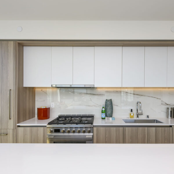 The sleek, contemporary kitchen is an entertainer’s dream, featuring a dramatic waterfall-edge island with generous prep space and casual seating. The dining area feels intimate yet connected, perfectly positioned to enjoy both conversation and the view.
