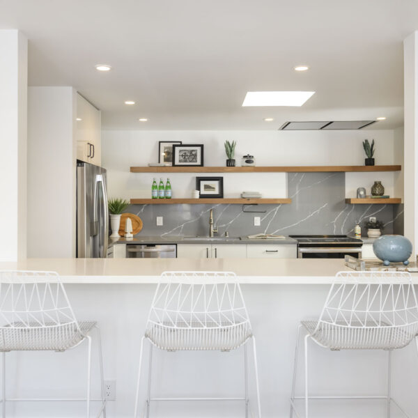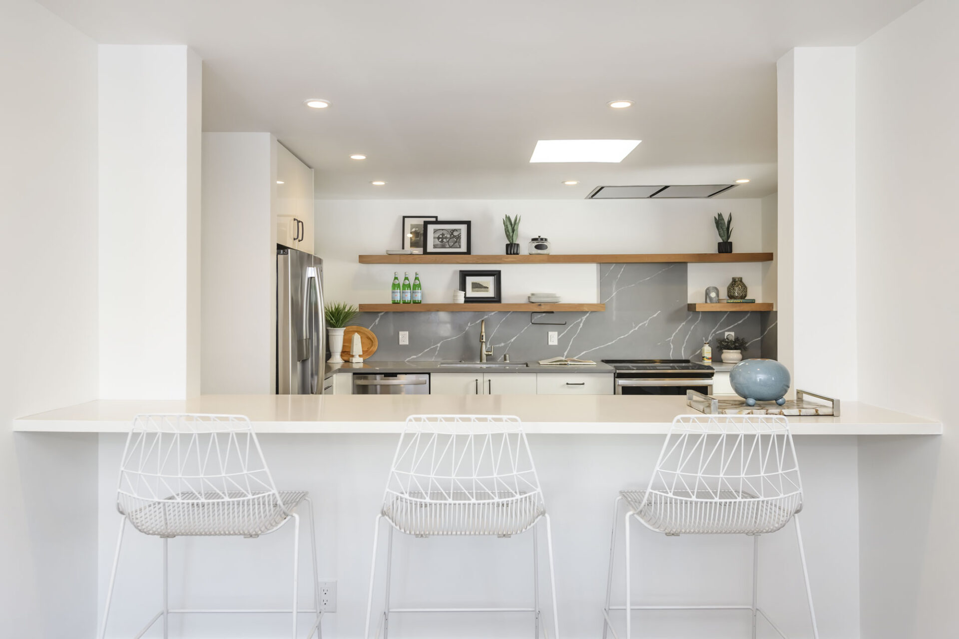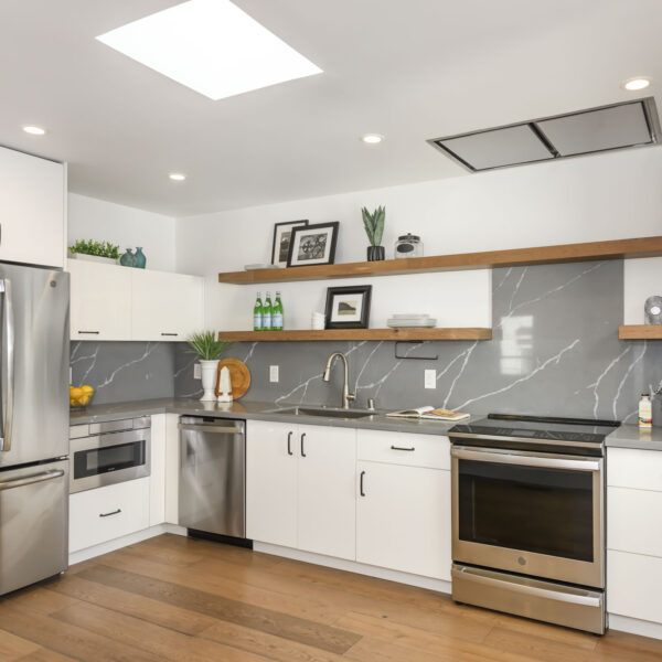 The skylight illuminates the modern kitchen, creating an open and inviting atmosphere. A long continuous counter run provides excellent prep space, while sleek white custom cabinetry, a dramatic Italian quartz backsplash, warm floating wood shelves, and a full suite of stainless-steel appliances—including an induction range and remote-controlled Zephyr ceiling hood—combine to deliver a beautifully balanced blend of style and functionality.