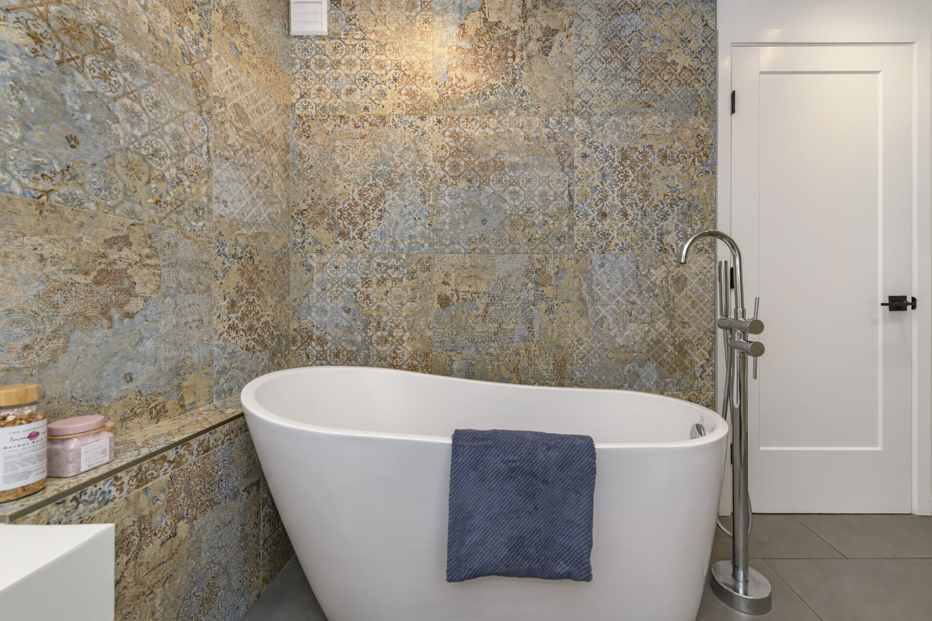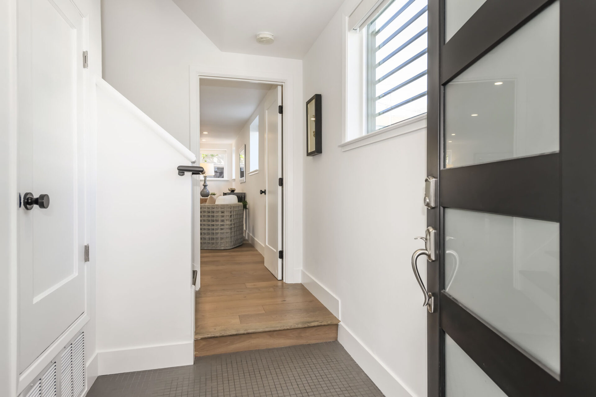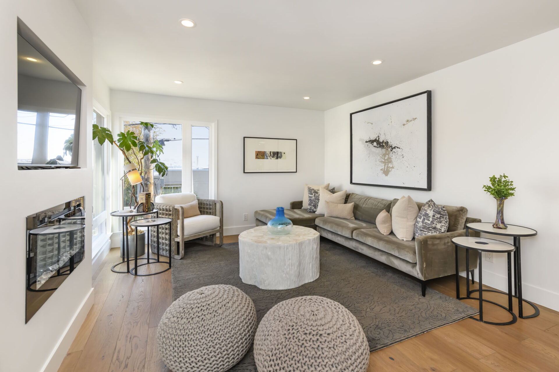 The living room features a custom recessed media wall with an integrated electric fireplace, establishing a sleek modern focal point that adds both warmth and architectural interest. Two bedrooms and a guest bath featuring a sleek, frameless glass shower with glossy gray subway tile and a recessed niche for a clean, modern look, creating a fresh, spa-inspired feel completes this level.