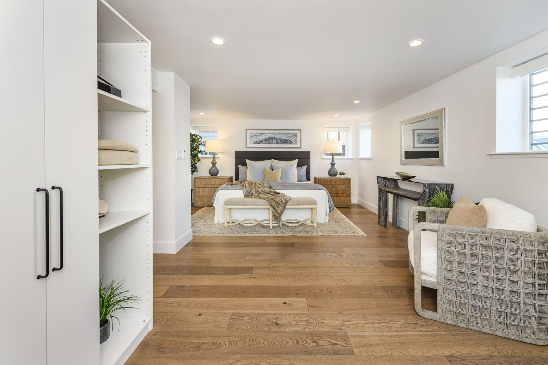 On the main level, the expansive primary suite feels like a true retreat, offering space for a king-size bed, a sitting area, or even a small workspace. A beautifully designed storage wall provides a mix of custom closets and open shelving, creating a boutique-style dressing area with abundant room for clothing, accessories, and display. Natural light filters through well-placed windows, with automatic shades—three of them featuring privacy film—enhancing the serene atmosphere throughout the day. The luxurious primary bath features a spacious shower, a wide single basin sink, with dual faucets, and a soaking tub. A glass door leads directly from the suite to the backyard. This level also offers a generous one-car garage with stacked washer and dryer, a utility sink, and a storage closet.